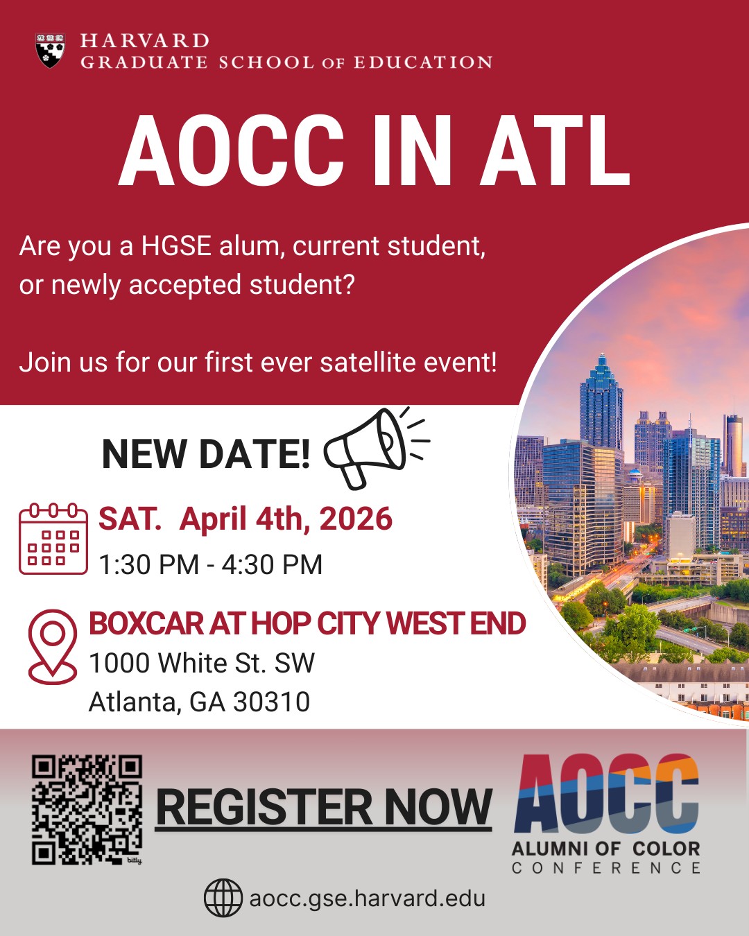 We are excited to share that Harvard Graduate School of Education's (HGSE) Alumni of Color Conference (AOCC) will be extending beyond Cambridge, MA this year. Through a partnership between the Office of Student Affairs and the Admissions Team, we are piloting an AOCC "satellite site" in Atlanta, GA to build community and create opportunities for leaders in education to learn, explore, and collaborate outside of the walls of a classroom.